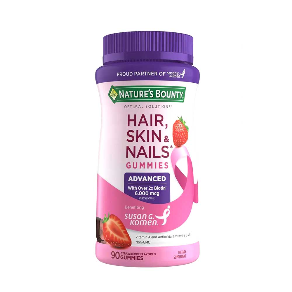 - Nature’s Bounty Advanced Hair, Skin and Nails Gummies, Biotin 6,000 mcg, Vitamins A, C, and E, Strawberry, 90 Count.